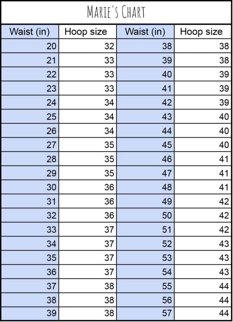 - Report your number in inches to the “Waist” column. For example, a 31″ waist would give a 36″ hoop diameter recommandation.