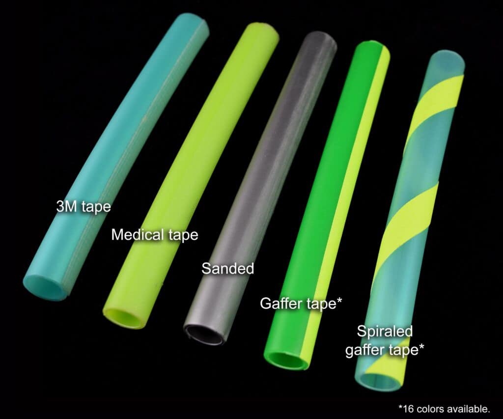 - 3M: This is the “Cadillac” of grip tapes. Its surface is covered by tiny gripping bristles that easily cling to clothing and skin. The clear color won’t interfere with the color of your hoop resulting in a really discreet look. 3M is a great ally to any advanced or beginner hooper, and works wonders for on-body multi-hooping. We sell pre-cut individual lenghts if you ever need to replace it or upgrade one of your current hoops.