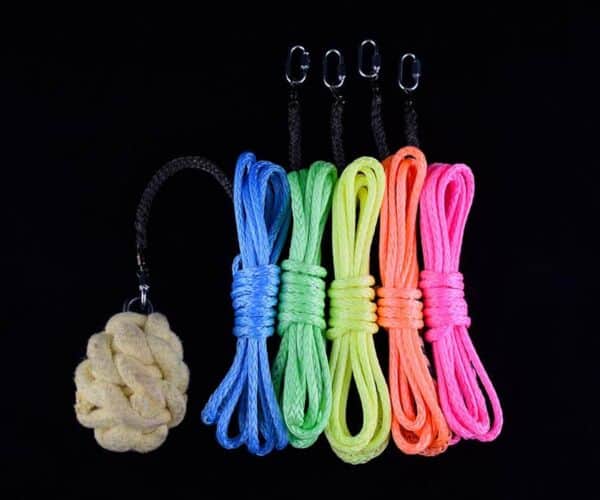 ▹ 11½ feet total of our popular UV rope dart leash. This 1/4″ HMWPE (Dyneema) rope that combines technology, strengh, softness and durability, have been spliced with Technora for it’s fire-resistant caracteristics and complemented with a heavy duty swivel + quick link attachment for easy set up. The rope comes in a selection of 5 color coatings: UV Pink, UV Orange, UV Yellow, UV Green and black (appears dark gray, not UV). UV colors are really bright and will react to blacklights. The color coating will gently fade with time but the rope will last for ages and become even softer as it breaks in.