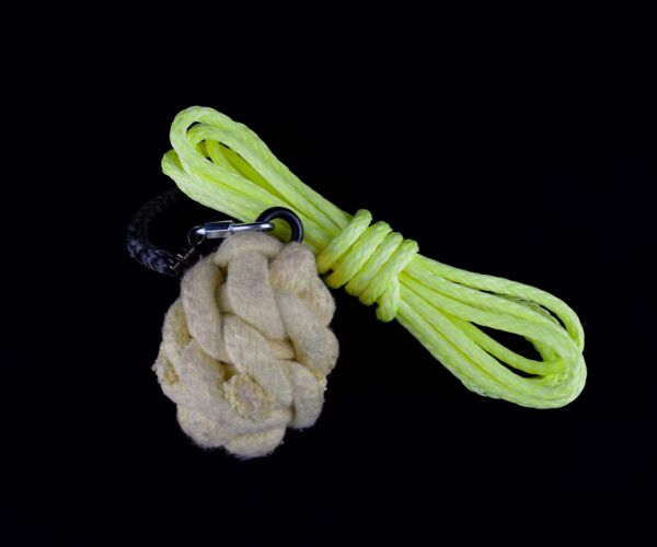 ▹ 11½ feet total of our popular UV rope dart leash. This HMWPE (Dyneema) rope that combines technology, strengh, softness and durability, have been spliced with Technora for it’s fire-resistant caracteristics and complemented with a heavy duty swivel + quick link attachment for easy set up. It comes in a selection of 5 color coatings.