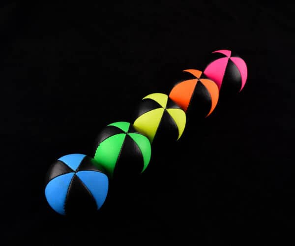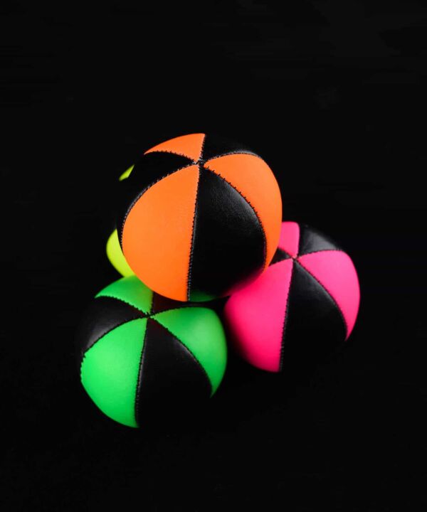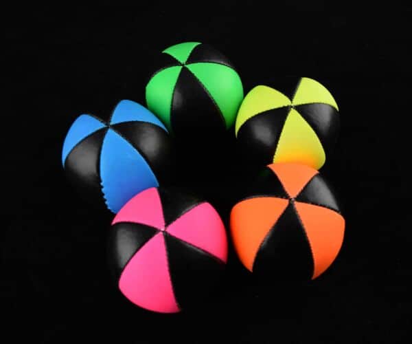 These 6 panel juggling balls are a ‘pro’ version of the popular star balls. They are made from strong faux leather and are built to last. The toughness of the material used makes them ideal for outdoor juggling. In addition the UV panels look great under a black light and increase the ball’s visibility during the day. We’ve found that they take around a week to soften – however once this is done they will keep their shape and ‘catchability’ for years.