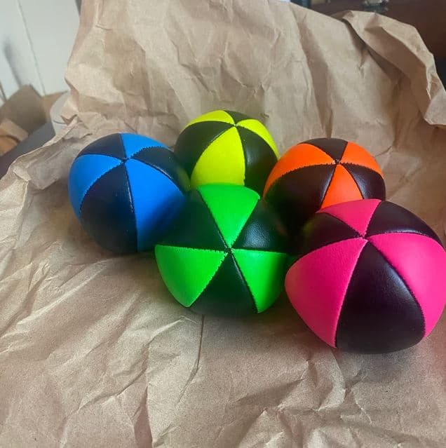 These 6 panel juggling balls are a 'pro' version of the popular star balls. They are made from strong faux leather and are built to last. The toughness of the material used makes them ideal for outdoor juggling. In addition the UV panels look great under a black light and increase the ball's visibility during the day. We've found that they take around a week to soften - however once this is done they will keep their shape and 'catchability' for years.